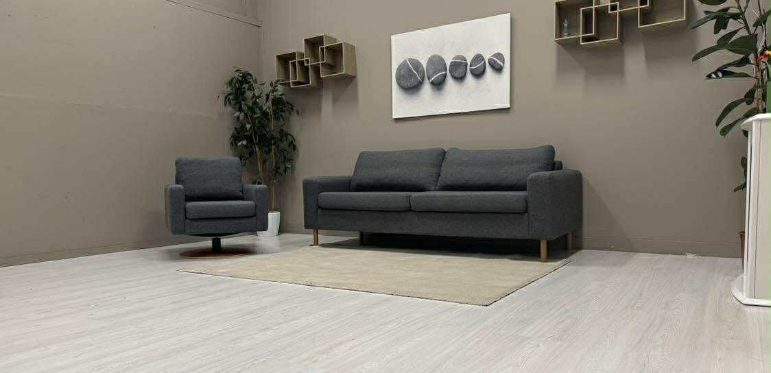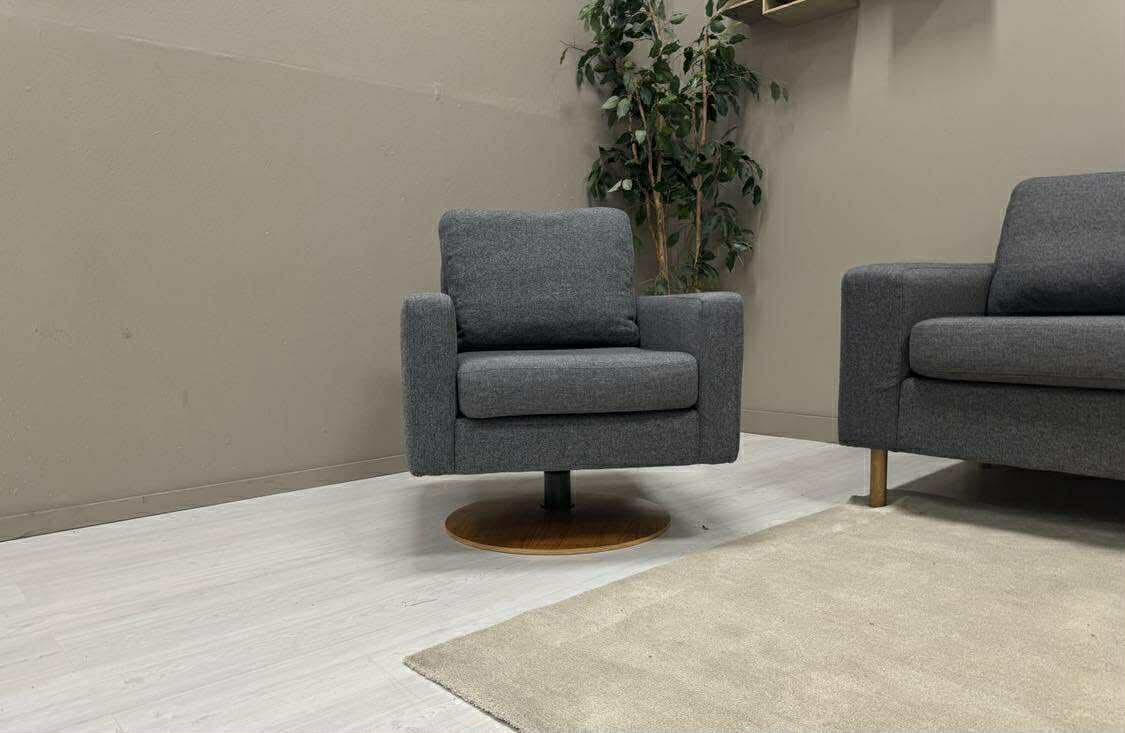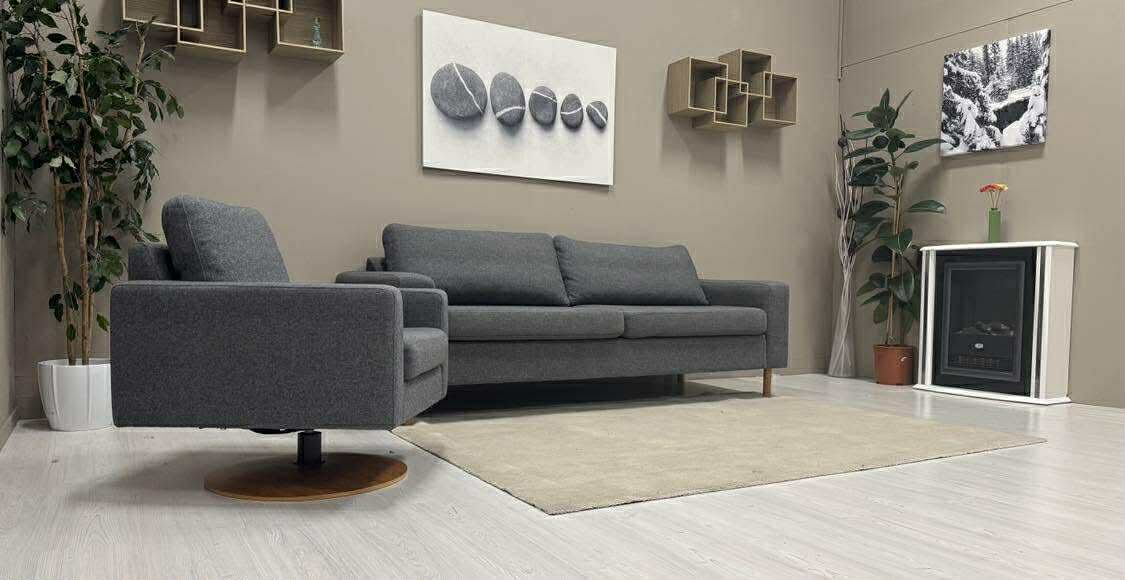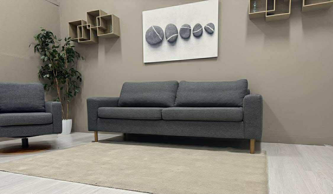 Grå sofa med matchende lenestol – tidløs og komfortabel