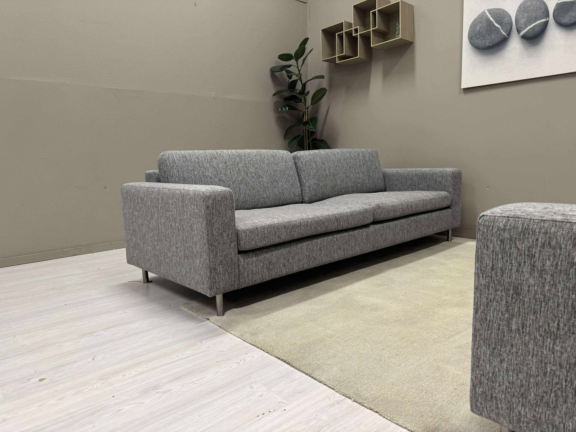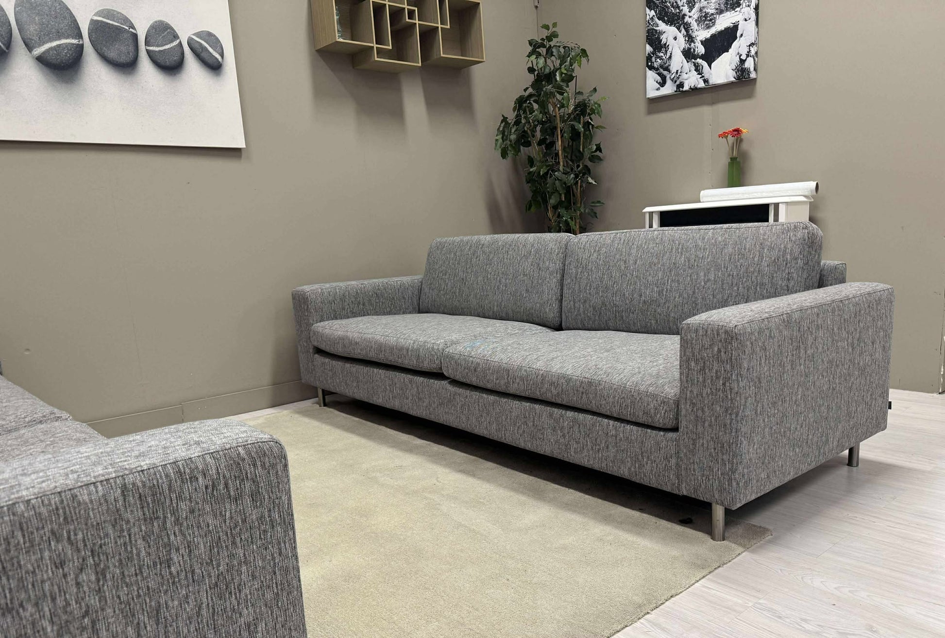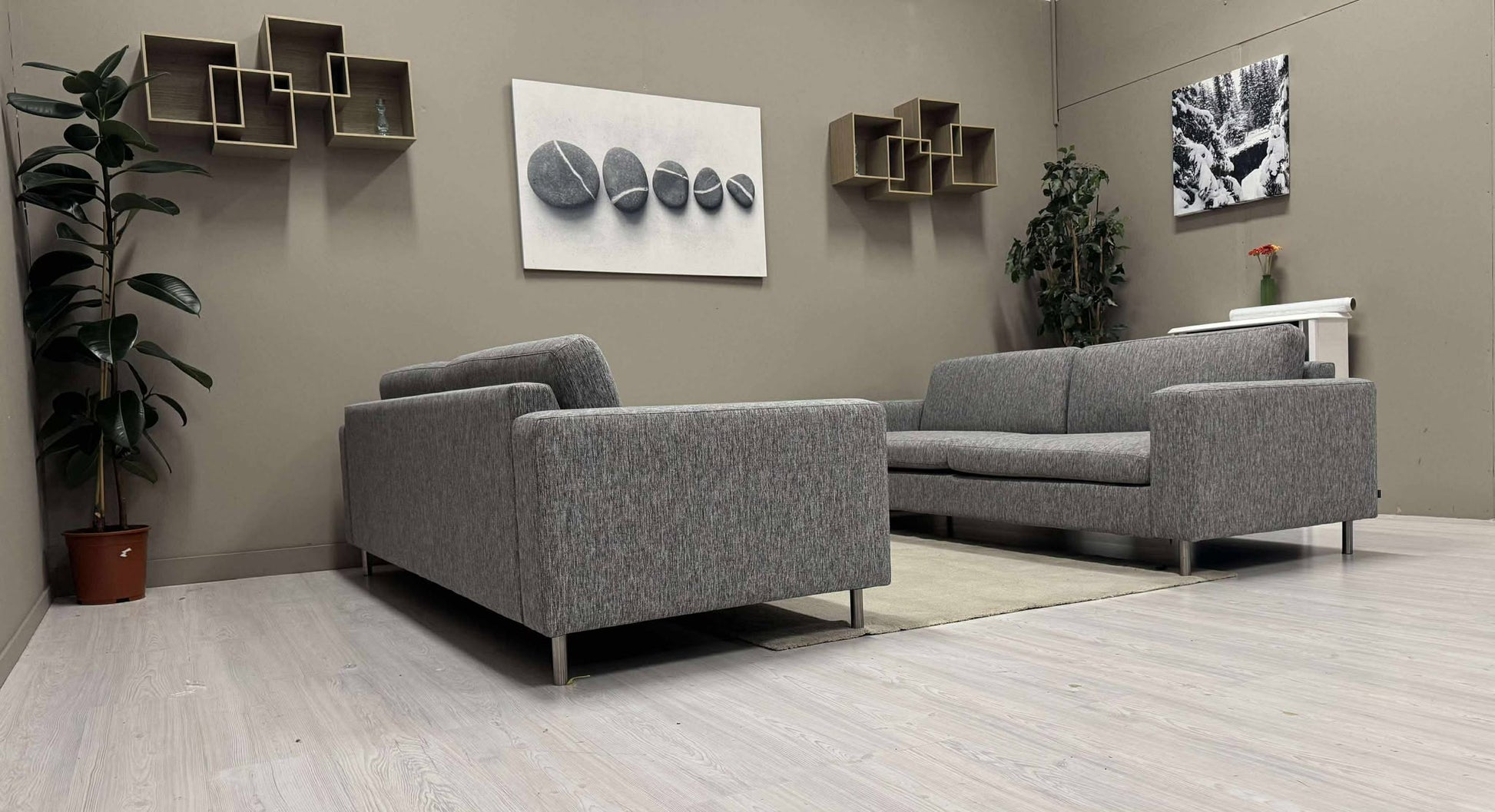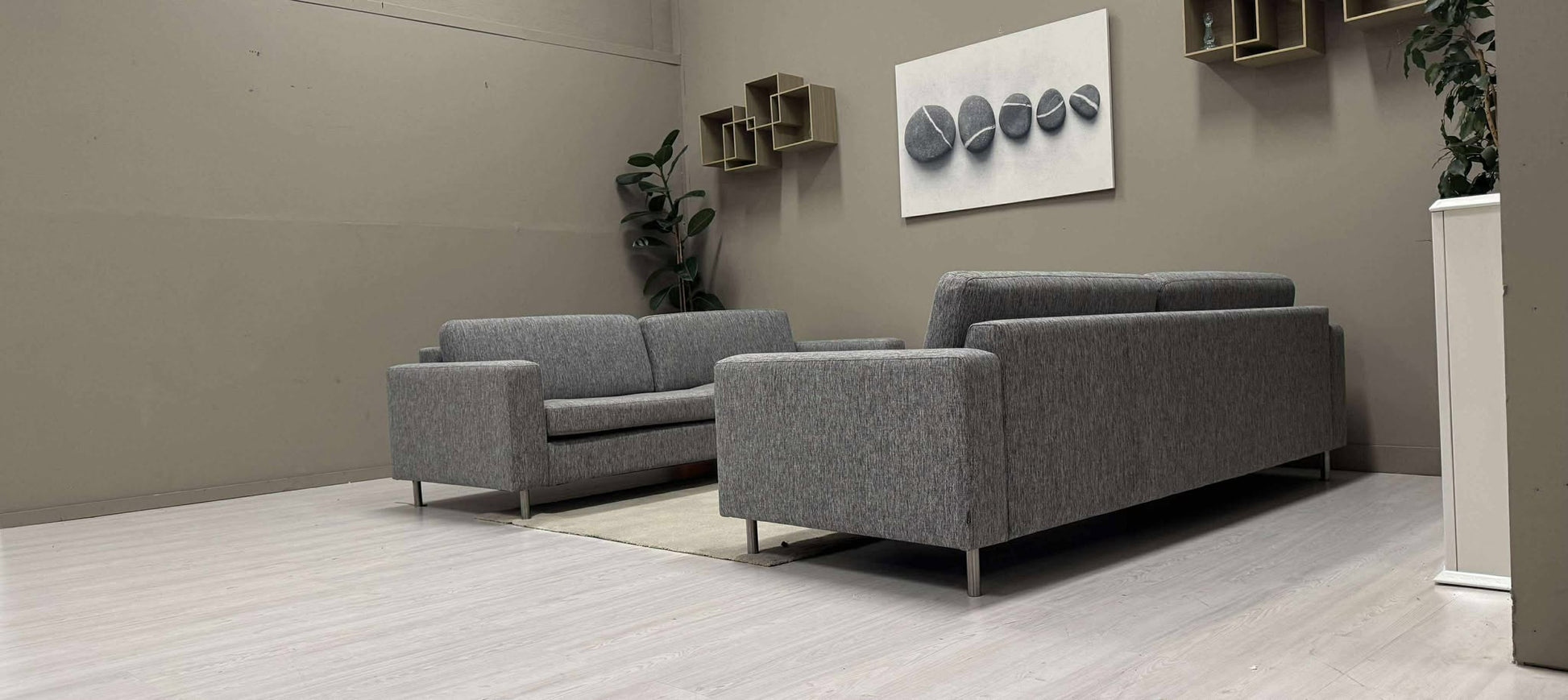 Denne sofagruppen fra Bolia kombinerer moderne design med førsteklasses sittekomfort. Med sitt stramme uttrykk, rette linjer og slitesterke grå tekstil passer den perfekt inn i alt fra minimalistiske til mer hjemmekoselige interiører. Setene er dype og komfortable, og putene gir en stødig, behagelig følelse som gjør sofaen like god til både filmkvelder og gjesteprat. Den stilrene gråfargen gjør møbelet enkelt å matche med ulike farger og interiørstiler. Dette settet består av to sofaer, ideelt både til større stuer eller til deg som ønsker en harmonisk og sammenhengende sofasonseløsning. Sofaen har ingen avvik.