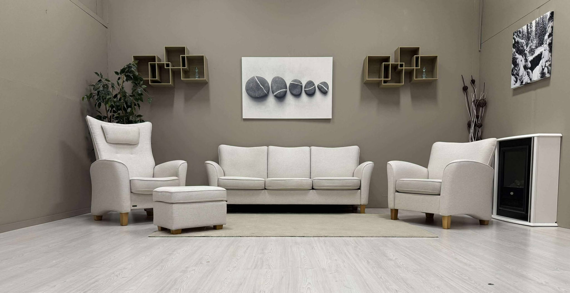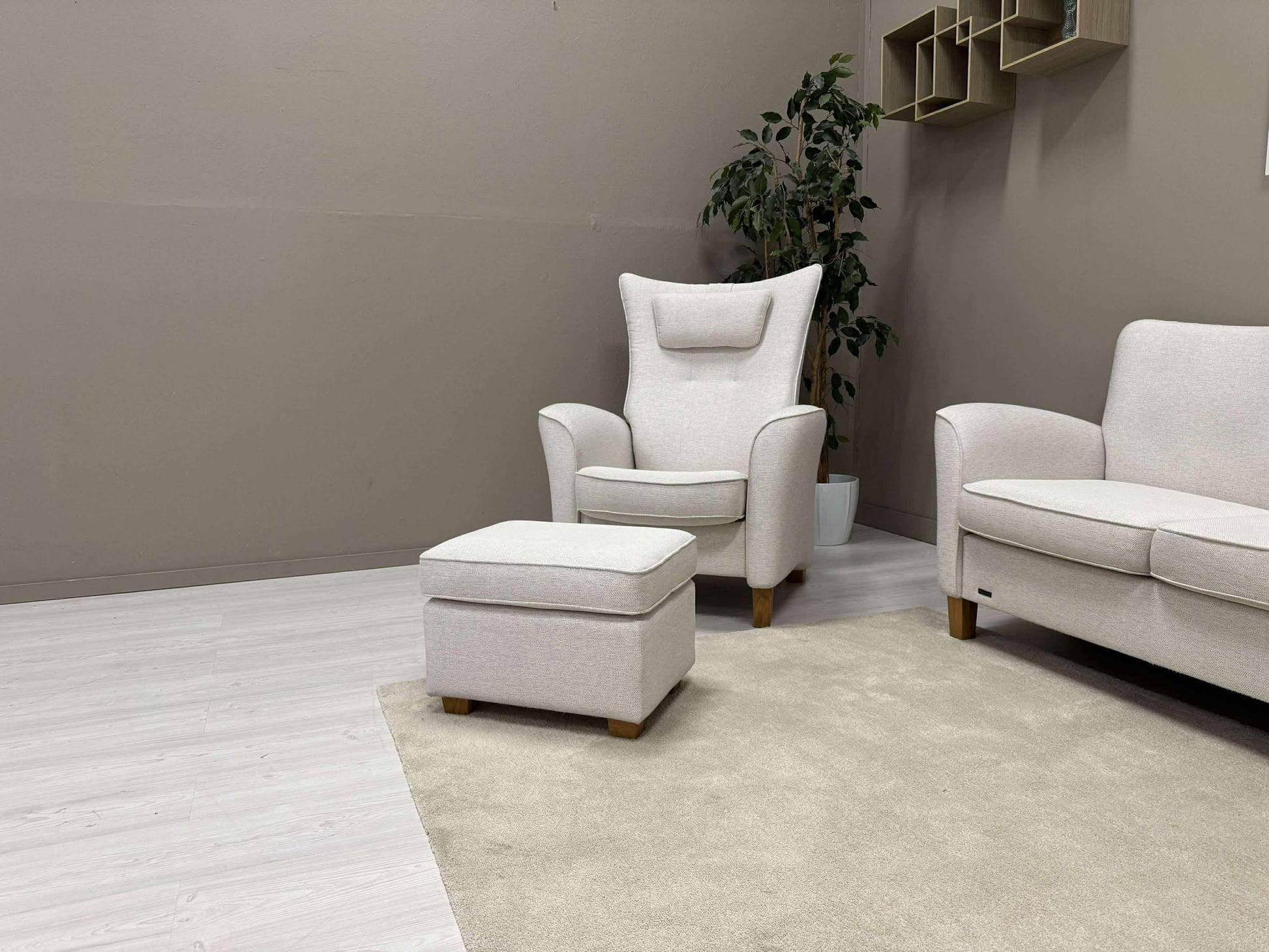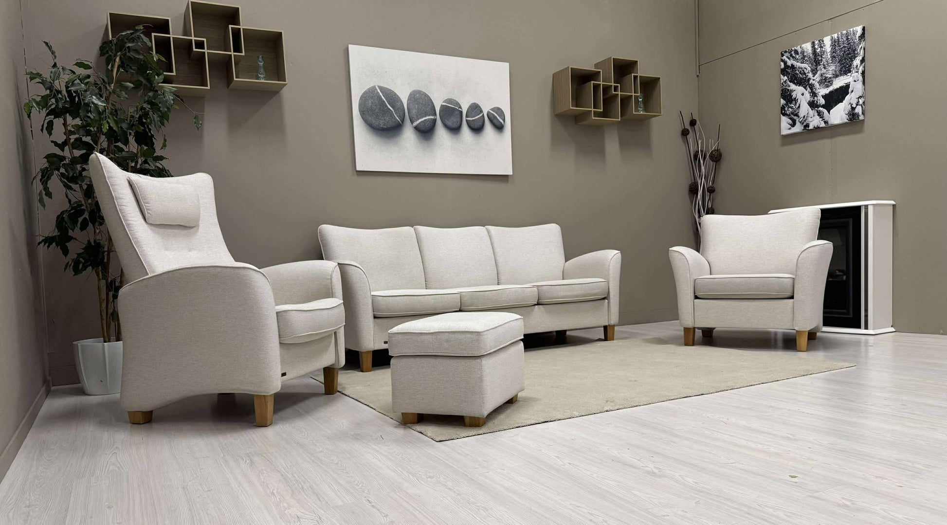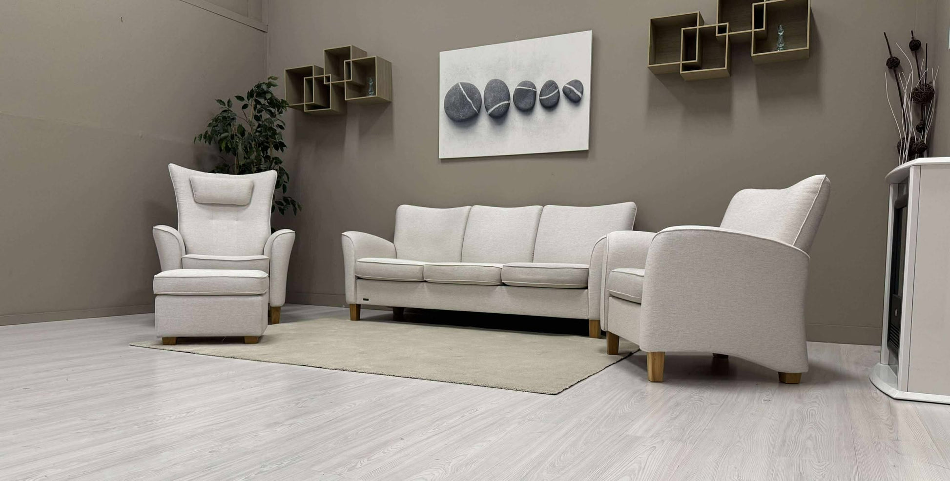 Den hvite Fia sofagruppen fra Brunstad er både stilig og komfortabel. Den lyser opp stuen din og skaper en hyggelig atmosfære. Hvilestolen har en vippefunksjon for ekstra avslapning.